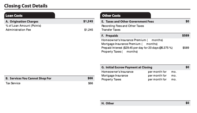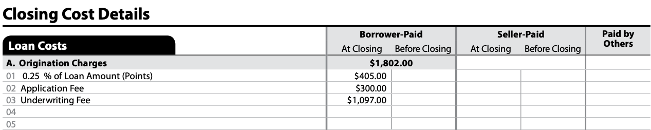 This page contains an itemized list of every closing cost you’ll pay, along with an estimate of how much cash you’ll need to close. One of the biggest fees is the origination charge. It consists of the lender’s fee to process and underwrite your loan, plus any discount points you choose to pay to lower your interest rate. It’s typical to pay around 1% of the loan amount in origination charges.
