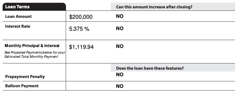Certain parts of the Loan Estimate might include terms you’re unfamiliar with. For example, the “Loan Terms” box on page 1 shows whether the loan has a prepayment penalty and balloon payment.