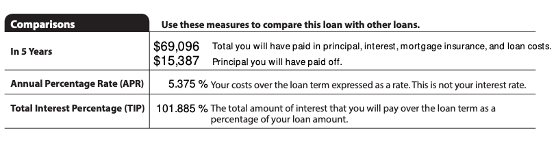 This page of the Loan Estimate contains a “Comparisons” section. It shows how much the loan will cost you during the first five years and how much of that cost will go toward loan principal. The loan’s APR is listed here as well.