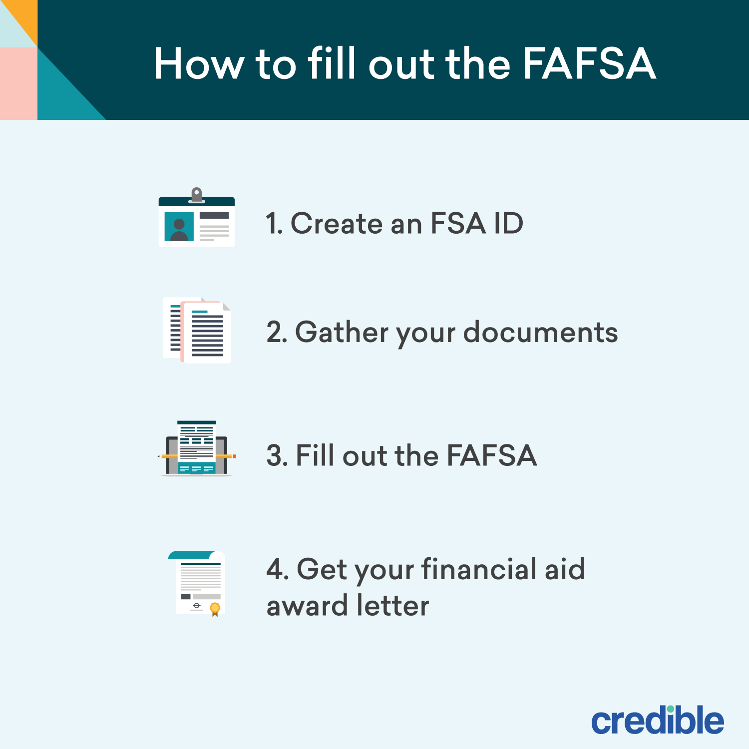 - Get your financial aid award letter. Once you’ve completed the FAFSA, your school’s financial aid office will send you a financial aid award letter. This letter will detail the federal student loans and grants you qualify for. You can then decide which aid you’d like to accept.