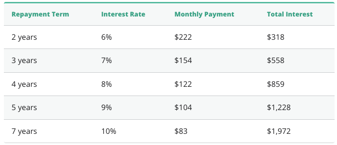 The table below shows the relationship between the loan repayment term, interest rate, monthly payment, and total interest charges. The interest rates in the table are hypothetical and are for illustration purposes only.