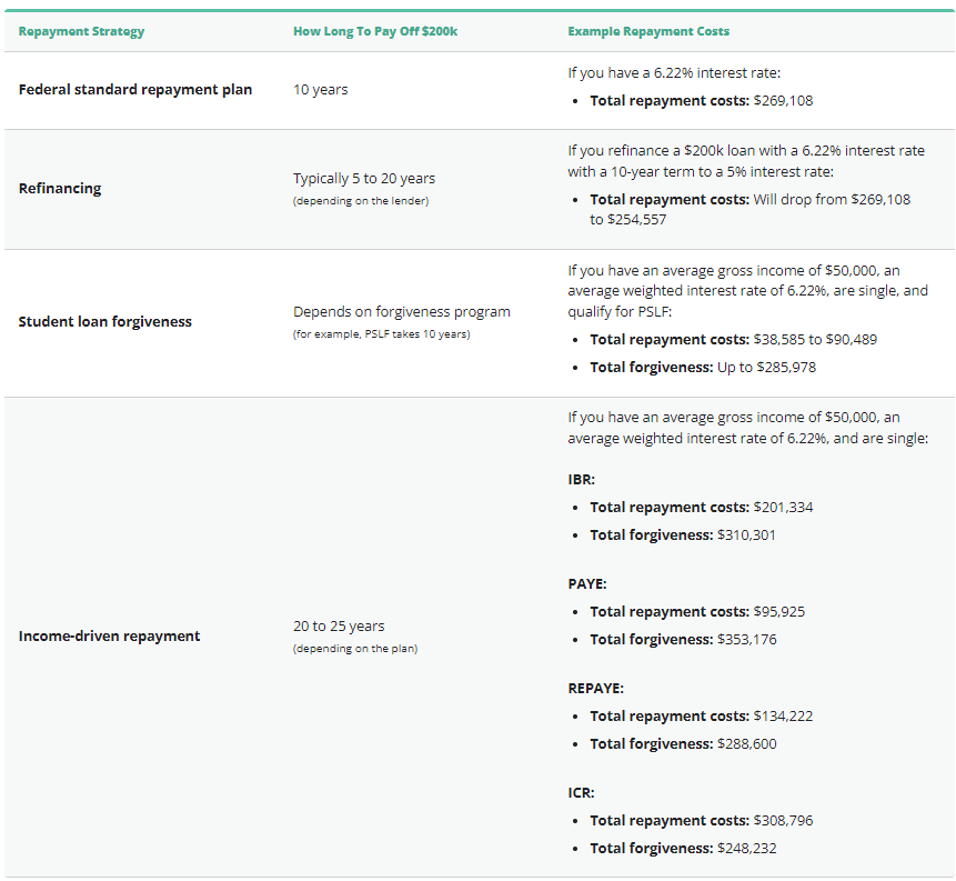 This will depend on how you approach your repayment. For example, paying off a refinanced loan might take a shorter time than pursuing forgiveness through an IDR plan.