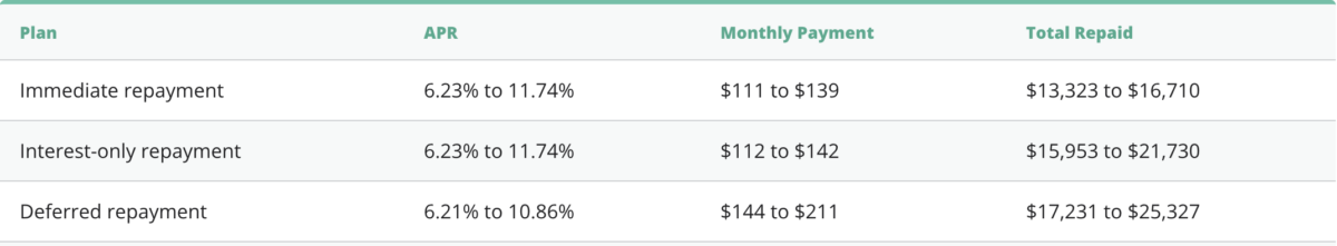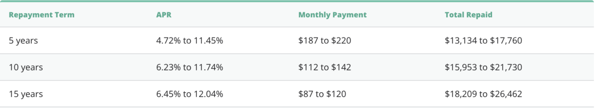 The repayment term is how many years of full monthly payments you’ll make before your loan is paid off. Picking a shorter repayment term can not only get you a better interest rate, but you’ll pay less in total interest because you’re paying down principal faster. The tradeoff is that the shorter the repayment term, the higher your monthly payments.