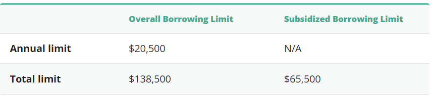 The annual borrowing limit for grad students is $20,500 a year, and you can borrow up to $138,500 in total, including the loans you took out as an undergraduate. Since July 1, 2012, grad students aren’t eligible to take out subsidized loans anymore. But it’s possible for grad students who took them out before then to have up to $65,500 in subsidized loans.